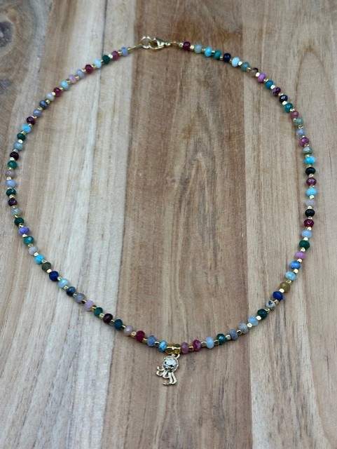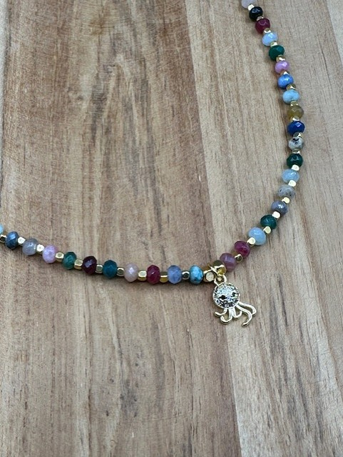 kettinkje van gekleurde jade en stainless steel gouden kraaltjes met een bedeltje van een octupus.