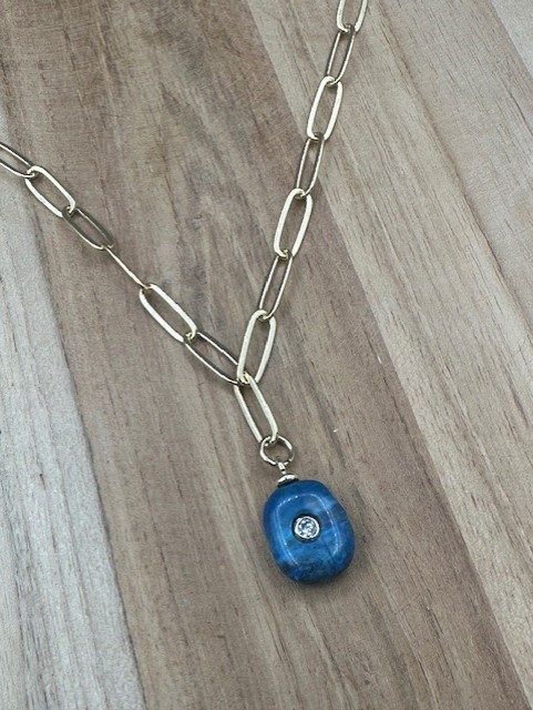 Goudkleurig stainless steel kettinkje met een paperclipschakel en een bedel van blauwe agaat met een zirkoniasteentje.