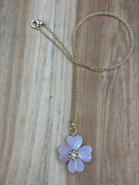 Goudkleurig stainless steel kettinkje met een rozenkwarts bloem.