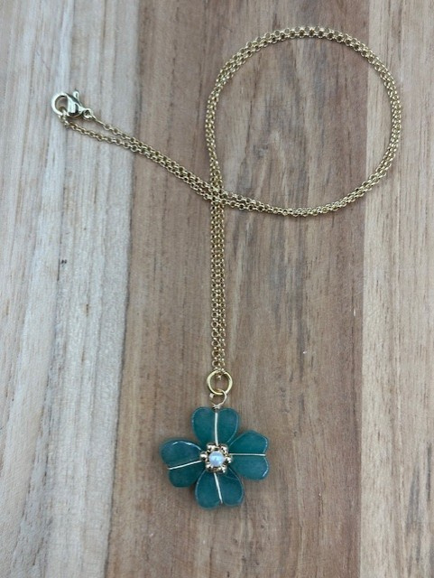 Goudkleurig stainless steel kettinkje met een jade bloem.
